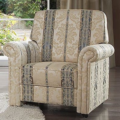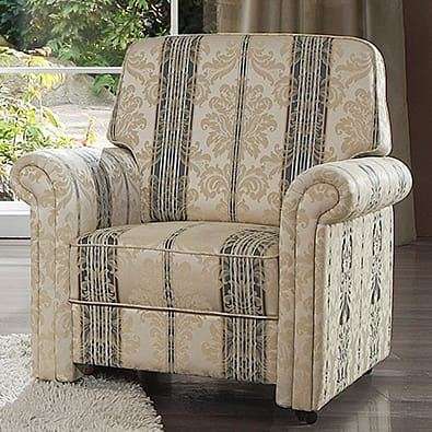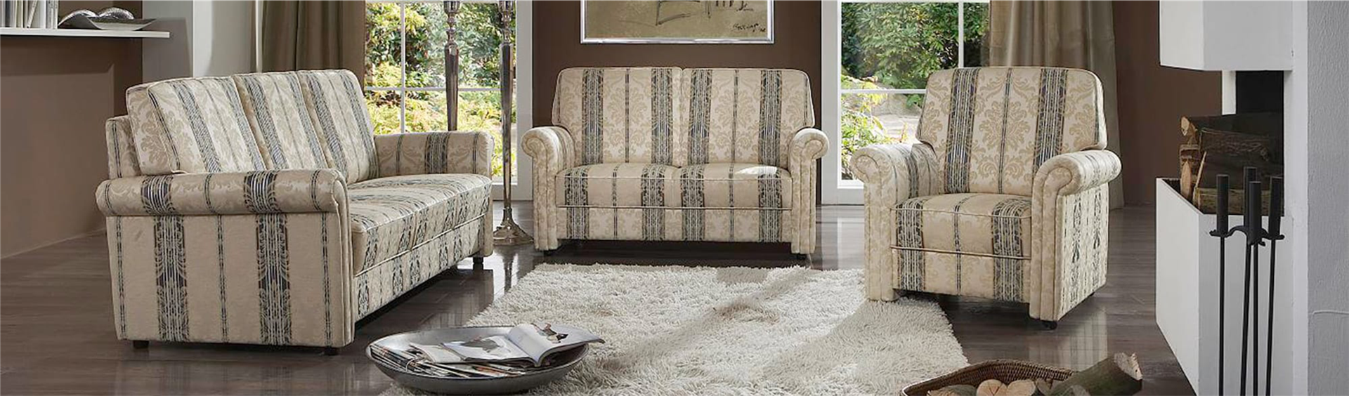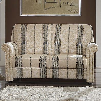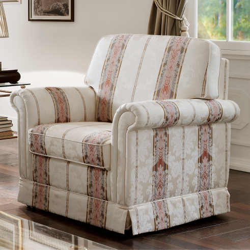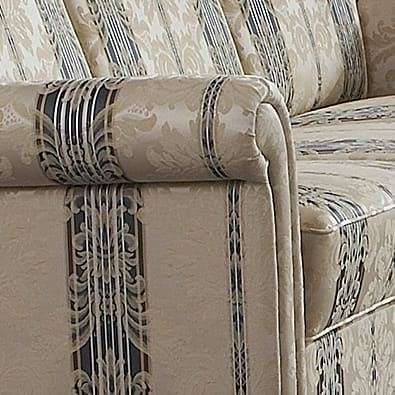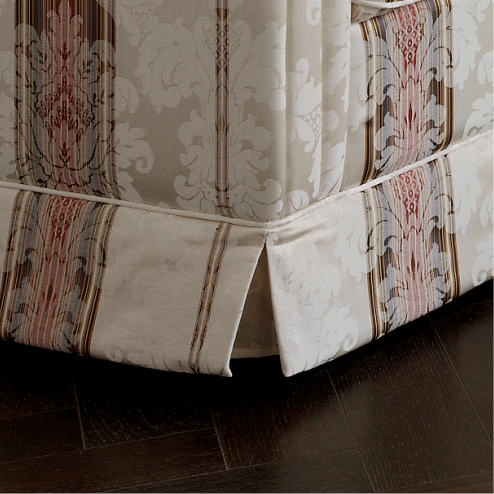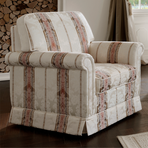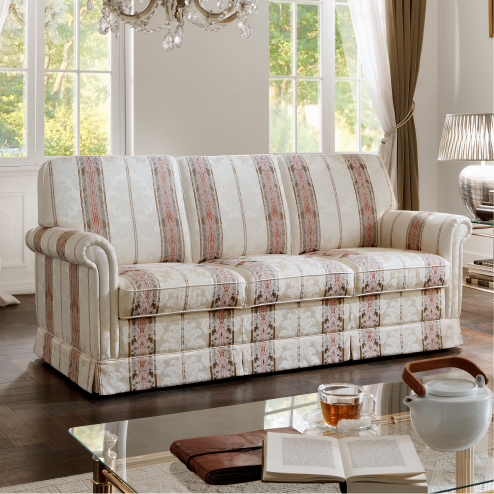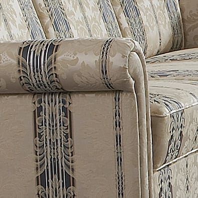 Vor allem der Bezug entscheidet über den Charakter des Polstermöbels. Der in der Abbildung dargestellte Stoff ist ein bildschönes, klassisches Liseré, deren feines Muster durch verschiedenfarbige Kettfäden entsteht. Ergänzt wird dieser mit aufwendigen und detailreichen Jacquards.