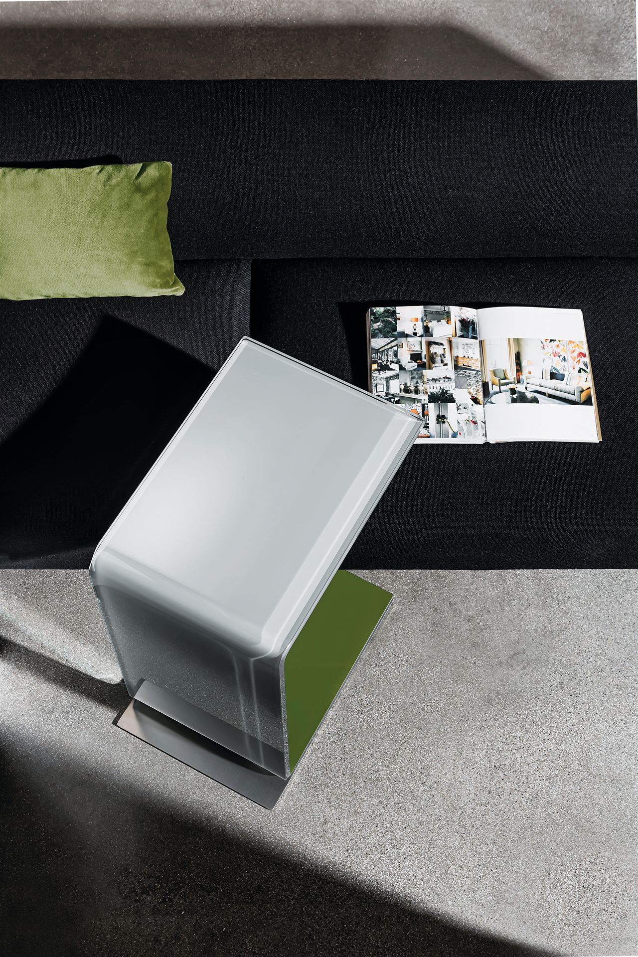 Swan ist ein multifunktionales Möbelstück: eine einzelne gebogene Glasplatte, die sich perfekt mit anderen modernen Einrichtungsgegenständen kombinieren lässt, auch dank der Möglichkeit, zwischen mehreren Farboptionen zu wählen.